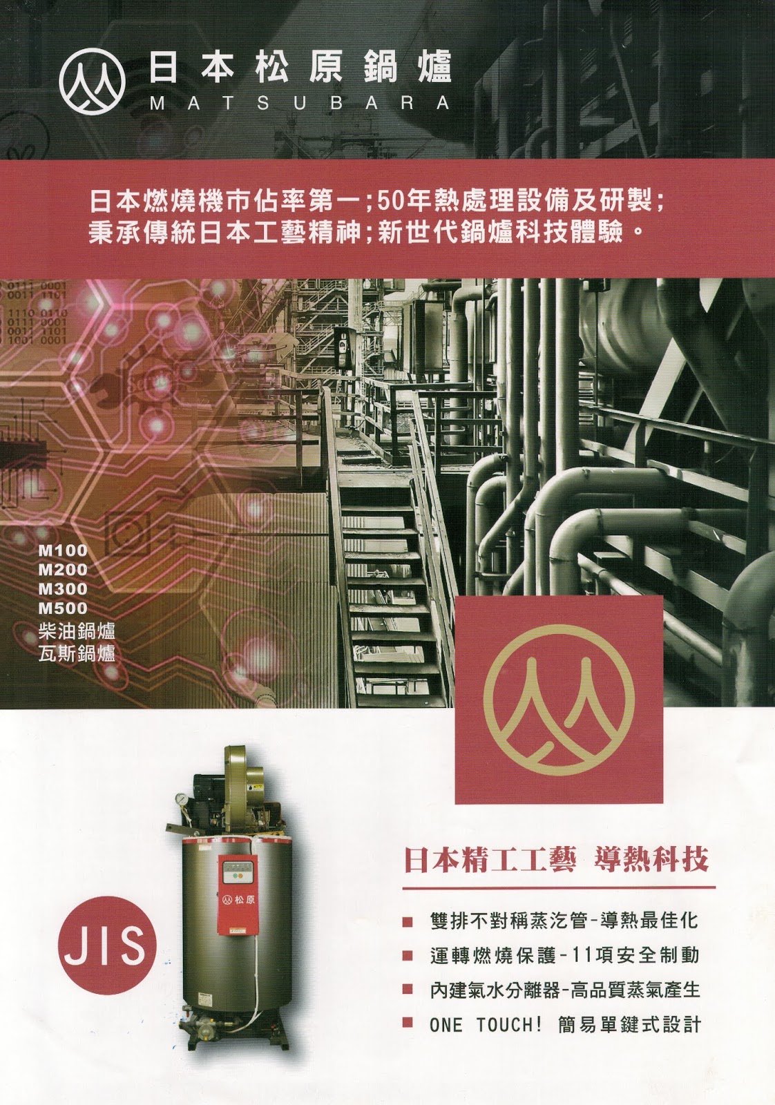 代理日本原裝進口貫流式蒸汽鍋爐,瓦斯鍋爐系列、柴油鍋爐系列。 功能/特點 ◎控制面板簡單易於操作。 ◎運轉顯示操作狀況。 ◎萬一發生水位和火焰異常,立即自動停止運轉。 ◎環保低噪音和低NOx。 ◎節省空間的設計。 ◎配備高性能汽水分離器,提高蒸氣乾燥度。 ◎蒸氣鍋爐主體內建多項防護設備,並可防止不當的操作及意外避免。